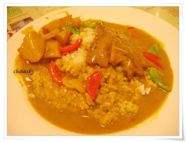 咖哩朱扒飯($100)。因為門口有貼說這個是必點的菜,正好肚子很餓所以就來了一盤,豬扒滿嫩的,咖哩不會辣,甜椒太多了我不愛,