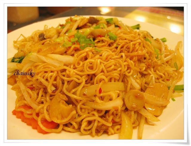 出前一丁炒麵($100ㄅ)。出前一丁就是泡麵的意思,所以這道菜就是炒泡麵,料很多,辣辣的很好吃,我最愛這道,一瞬間就被我清盤了。^^