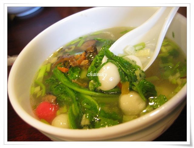 湯圓。本來以為是大的湯圓,裡面包肉的那種。送上來才知道是每次過年過節外婆家吃的那種小湯圓,有點小失望,沒什麼特別的地方。湯還不錯喝喇,不會太鹹。