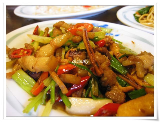 客家小炒。也是客家菜必點的。這道菜很好吃,而且很下飯,魷魚不會太硬,不過三層肉好像有點太肥了。